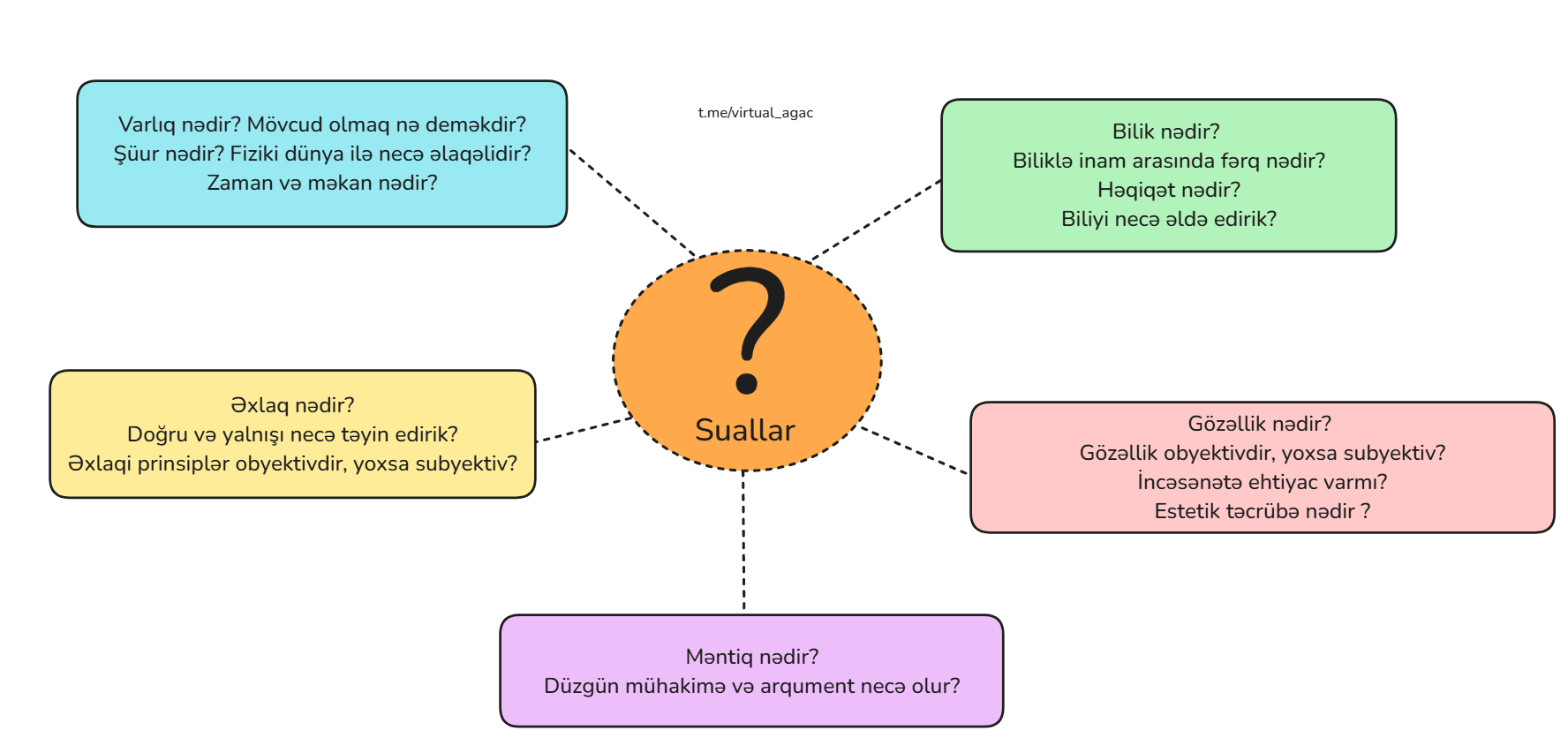 Qəliz fəlsəfi terminlərə girməzdən əvvəl, gəlin, aşağıdakı diaqramda sualların qruplaşmasına nəzər yetirək. Əslində bu sualların hər biri hansısa fəlsəfə qolunu yaradır.