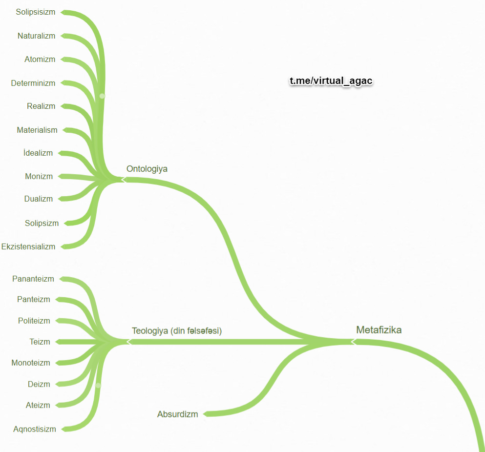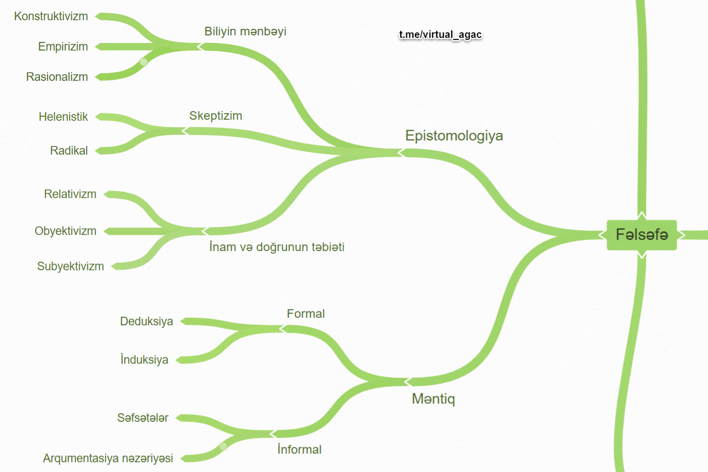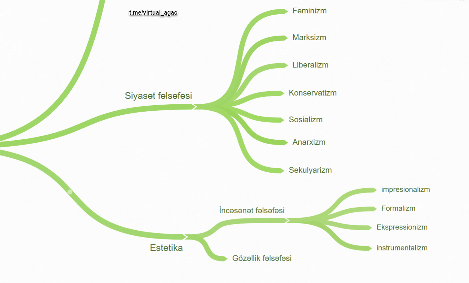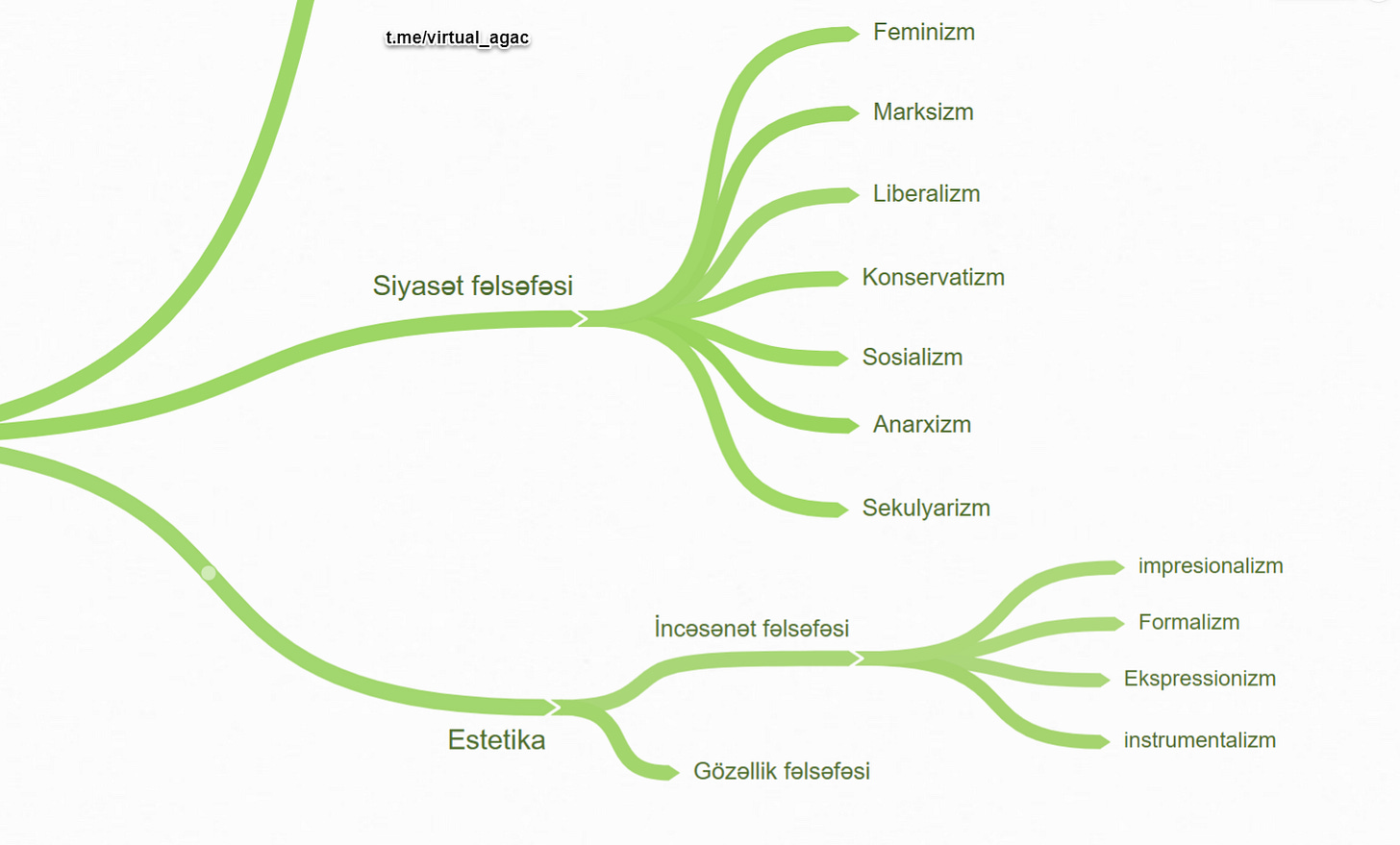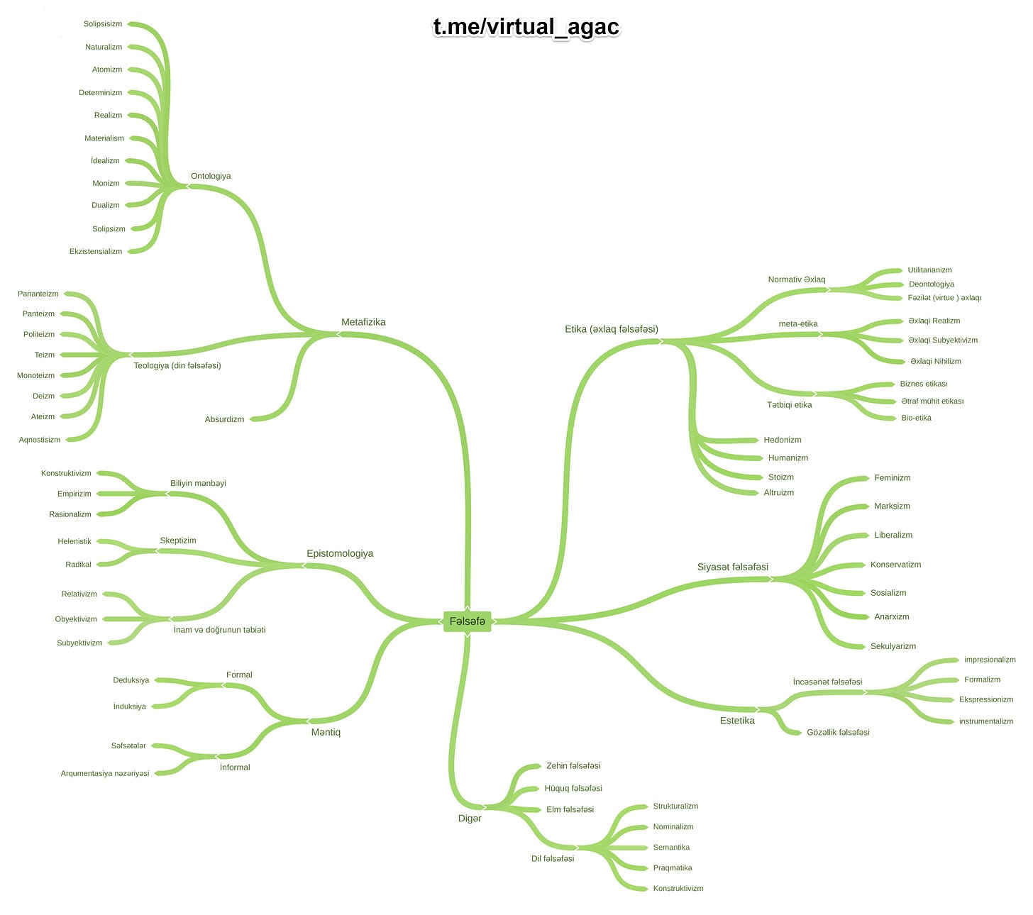 Sizin üçün fəlsəfinin qolları və onların tərkibində olana, əlaqəli olan bütün doktrinləri bir xəritədə topladım. Etiraf etməliyəm ki, özüm də yeni başlayan olduğum üçün, bunları qruplaşdırmaq çətin idi. Üstəlik tamamilə doğru deyil. Bəzi düşüncə cərəyanları bir neçə fəlsəfə qoluna aid ola bilər, təsir edə bilər.