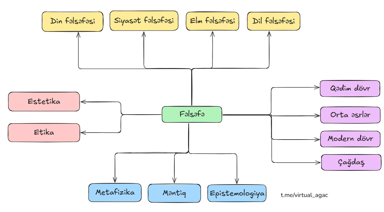 Fəlsəfəyə yeni başlayanlar üçün faydalı ola biləcək formada fəlsəfəni qollara bölmək olar. Bu qollar arasında sərt bir iyerarxiya yoxdur, onlar ya bir-birini tamamlayır ya da kəsişirlər. Şəkildə gördüklərinizi rənglər üzrə qruplaşdırmışam: göy rəngdə olan mövzular mənim öyrənmə planımdakı başlanğıc nöqtəmdir.